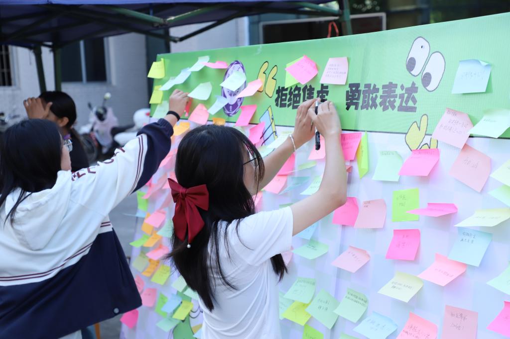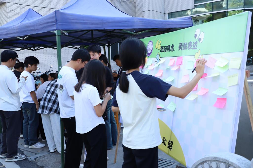 活动现场设置了“拒绝焦虑,勇敢表达”展板,同学们可以通过匿名写便签的方式,表达自己内心的焦虑或对学校工作的建议,并将便签粘贴到展板上。与此同时,其他同学可以随意选择一个焦虑便签,写上回复、鼓励的话语或提供解决方法,形成了积极的互动氛围。
