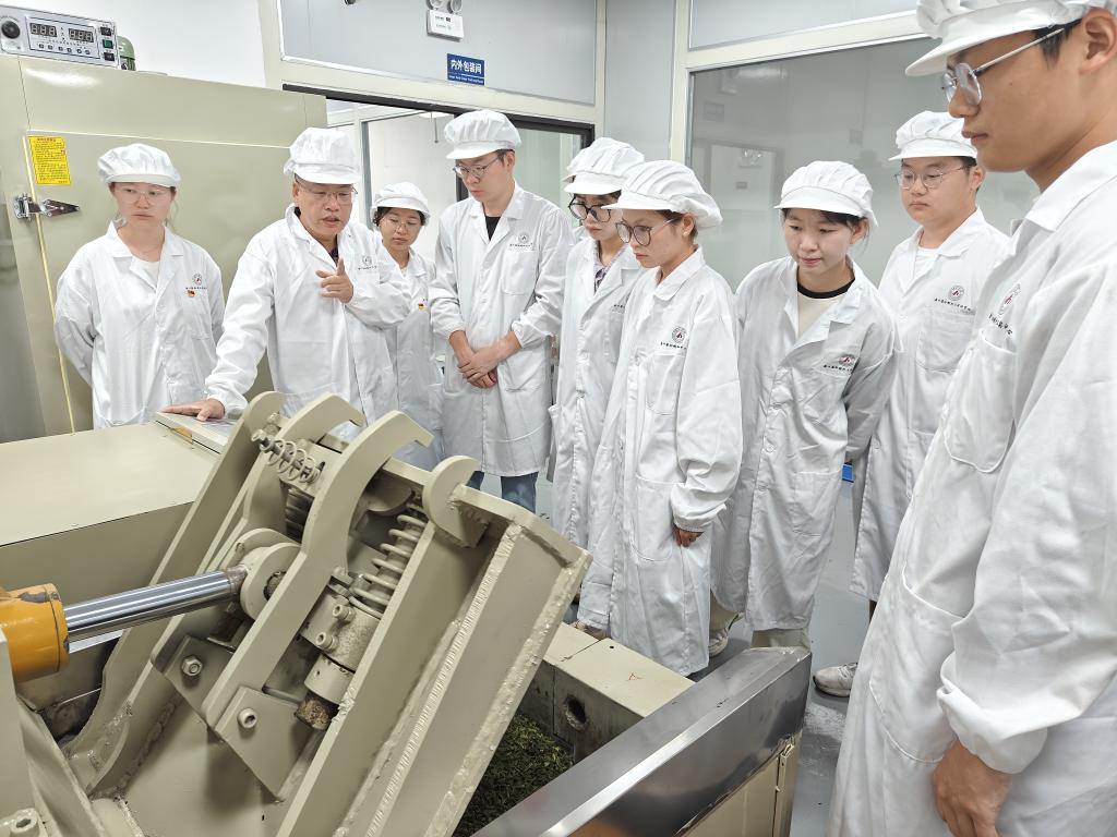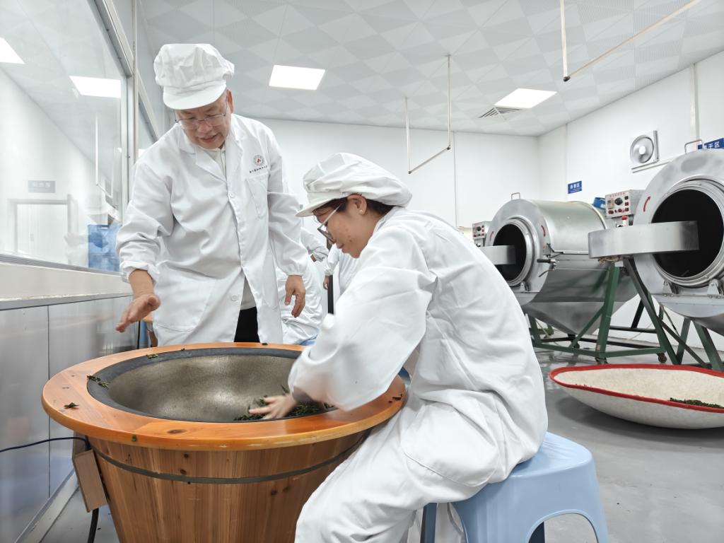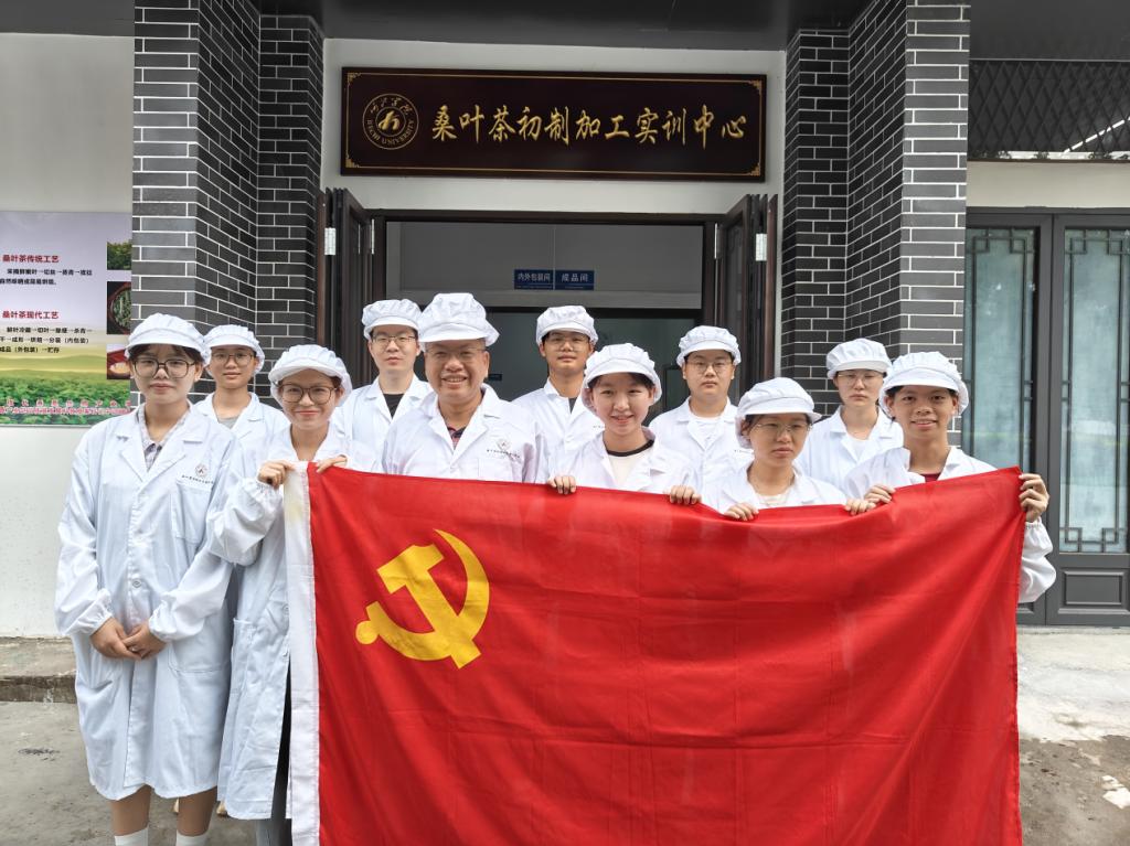 7月12日,党支部将实践课堂移至桑叶茶初制加工实训中心。在学院党委书记覃勇和韦庆进老师的专业指导下,党员同志们有序参与各道制茶工序。在切叶区,大家将新鲜桑叶切割处理;在原料除梗区,细致剔除粗叶脉;在杀青区,采用“先机械杀青、再手工杀青”的复合工艺,分组协作,精准把控温度与时间,亲身体验传统技艺的魅力。随后的烘干、造粒成型、过筛、烘焙等环节,同志们同样严谨专注。经过精心制作,7月13日上午,历经七小时烘焙的桑叶茶终于出炉,香气四溢。同志们分工协作,将其细心分装。