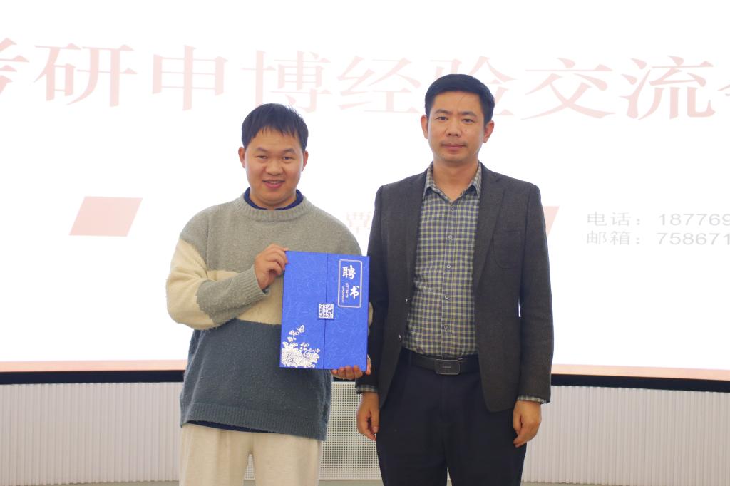 校团委周理副书记总结发言,勉励河池学院学生以覃福雨为榜样,锚定目标、读书改命,凭努力圆己硕博梦;愿持大梦大爱,用生命影响生命,有朝一日亦助人改变命运。最后,周理副书记为覃福雨颁发共青团河池学院委员会“见桥课堂”考研申博导师聘书,期待在他指导下,更多河池学院学子圆梦硕博,希望“我·河·你”一体化大思政课:“见桥课堂”的形式内容更丰富多彩,为更多河池学院青年老师和学生读书深造赋能,不断擦亮河池学院大思政品牌。(作者:曾子夏、黄晓樾 拍摄:何善秋、颜嫣语 校对:徐辛酉 审核:周理)