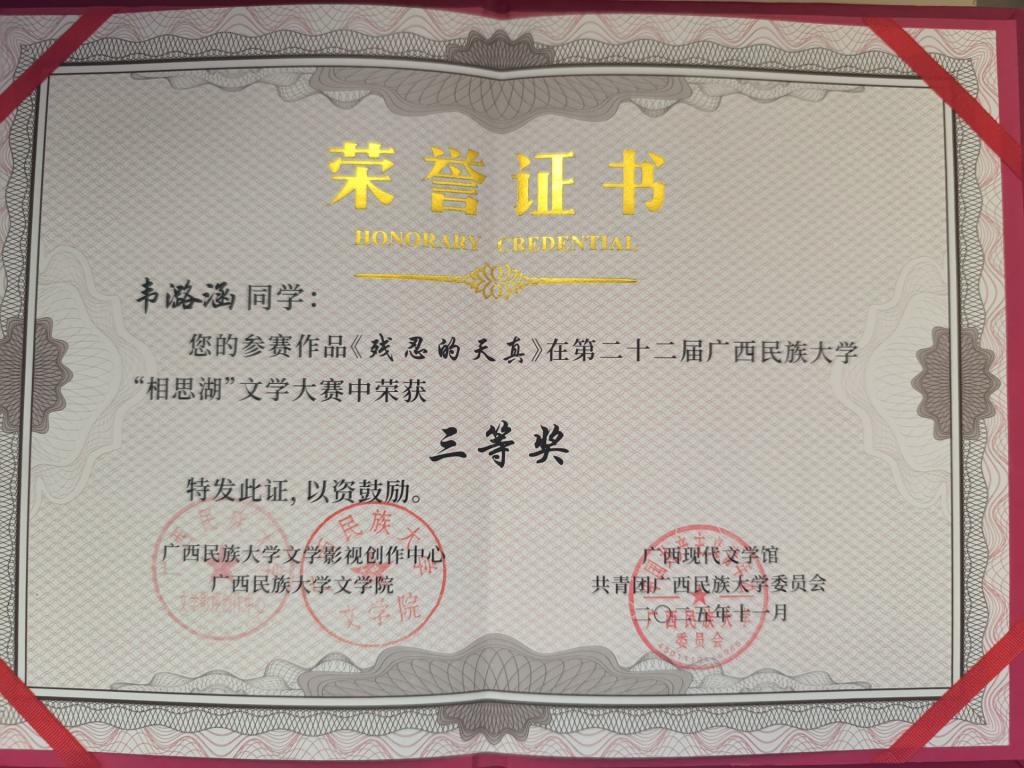 11月2日上午,第二十二届广西民族大学“相思湖”文学大赛颁奖典礼在广西民族大学相思湖校区文化研习基地举行。第二十二届“相思湖”文学大赛经半年征集,累计收到稿件3000余篇(份),经过四轮评审后,最终产生一等奖2篇,二等奖6篇,三等奖15篇和优秀奖20篇,共计43篇获奖作品。