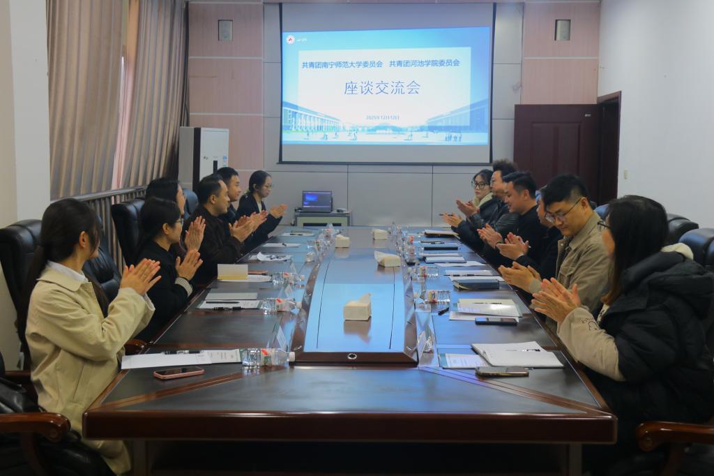 12月12日下午,南宁师范大学团委副书记何俊斌一行6人赴我校交流学习,在大学生活动中心408会议室顺利举行座谈交流会,我校团委及部分二级学院团委负责人共同参与。